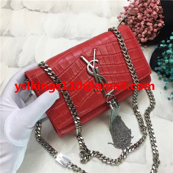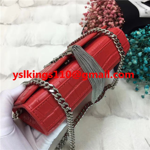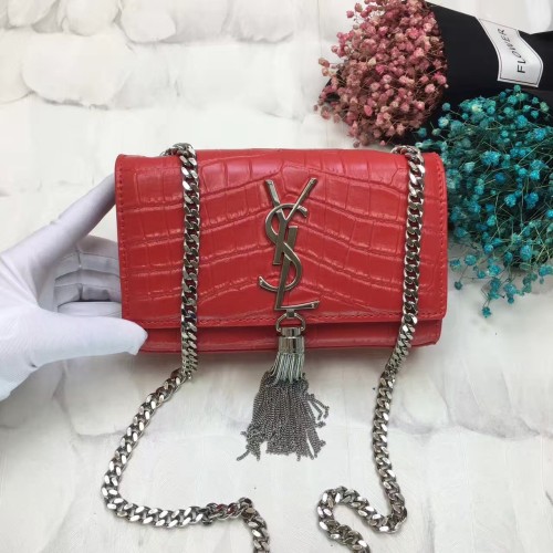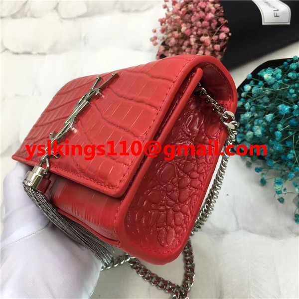 Torebka YSL z frędzlami i łańcuszkiem 17 cm, krokodylowo-czerwony, srebrny