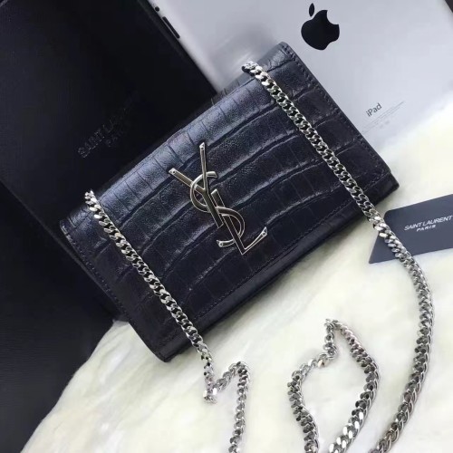 Torebka YSL z monogramem i łańcuszkiem 22 cm, krokodyl, czarno-srebrny
