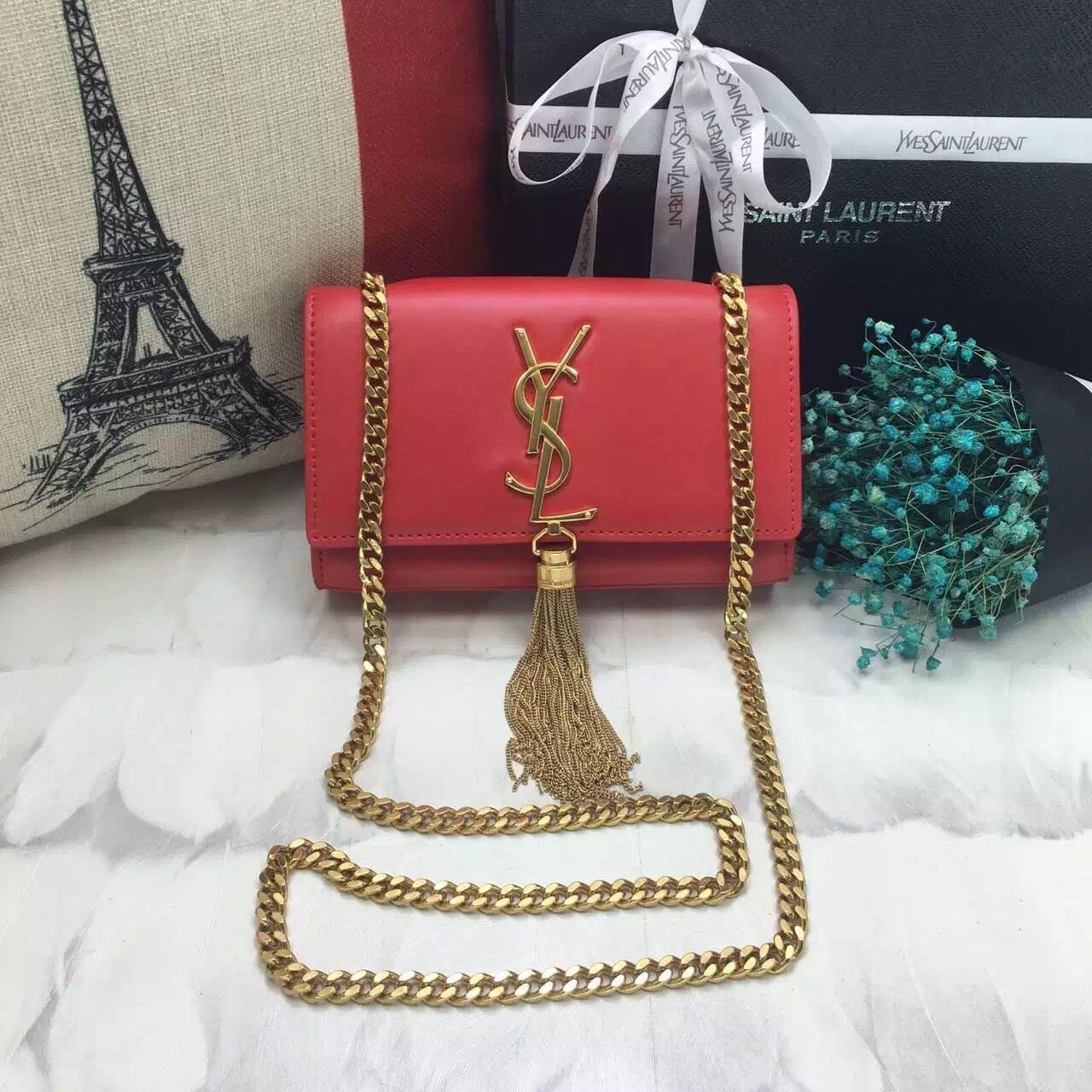 Mała skórzana torebka YSL z frędzlami i łańcuszkiem, 17 cm, czerwone złoto